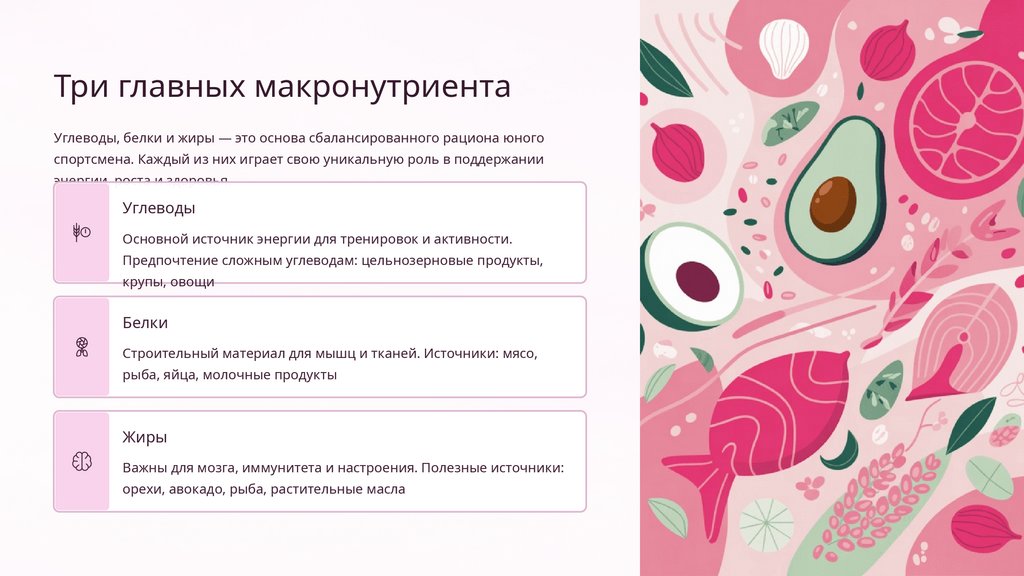 Три главных макронутриентаУглеводы, белки и жиры — это основа сбалансированного рациона юного