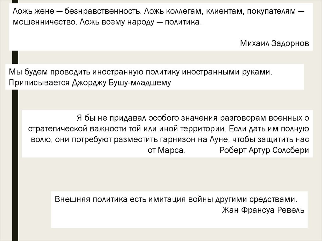 Ложь жене — безнравственность. Ложь коллегам, клиентам, покупателям —мошенничество. Ложь всему народу — политика.