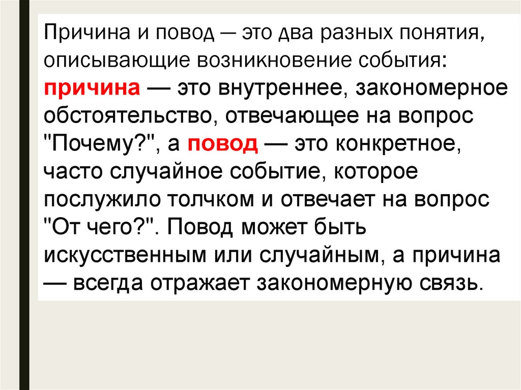 Причина и повод — это два разных понятия,описывающие возникновение события: