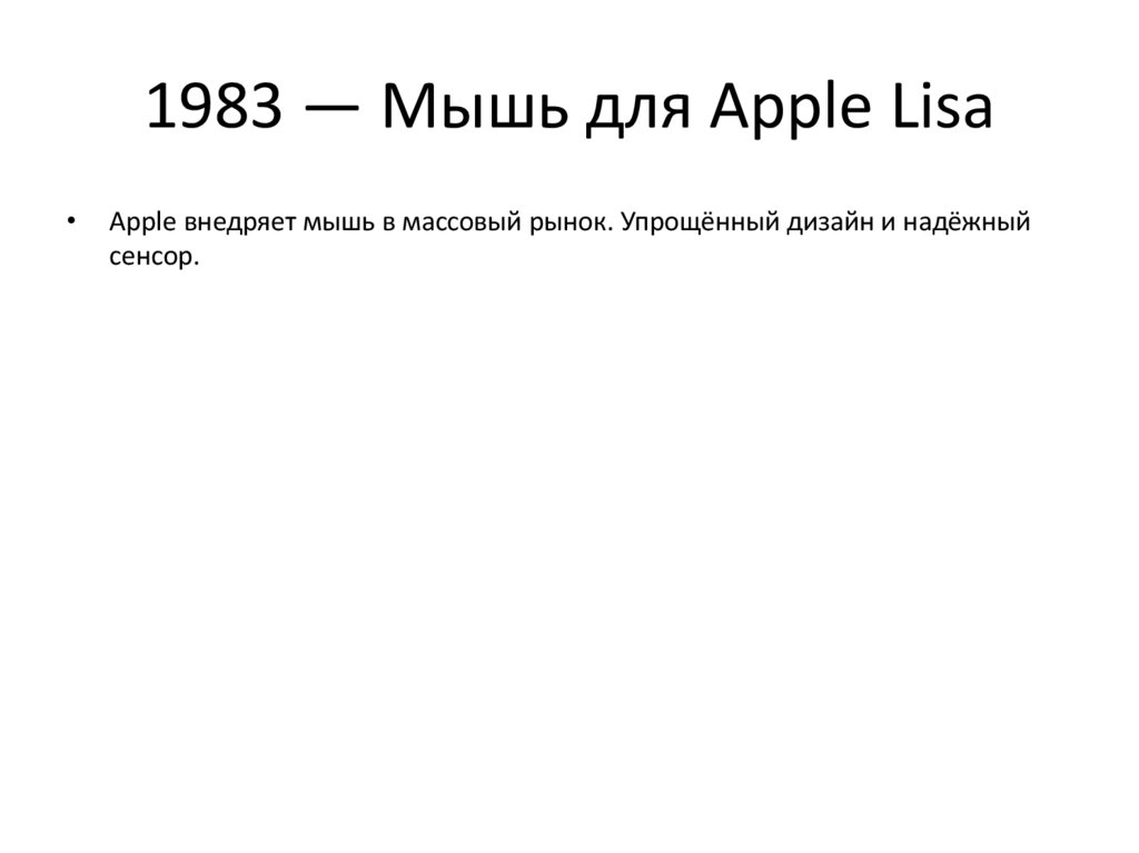 1983 — Мышь для Apple LisaApple внедряет мышь в массовый рынок. Упрощённый дизайн и надёжный