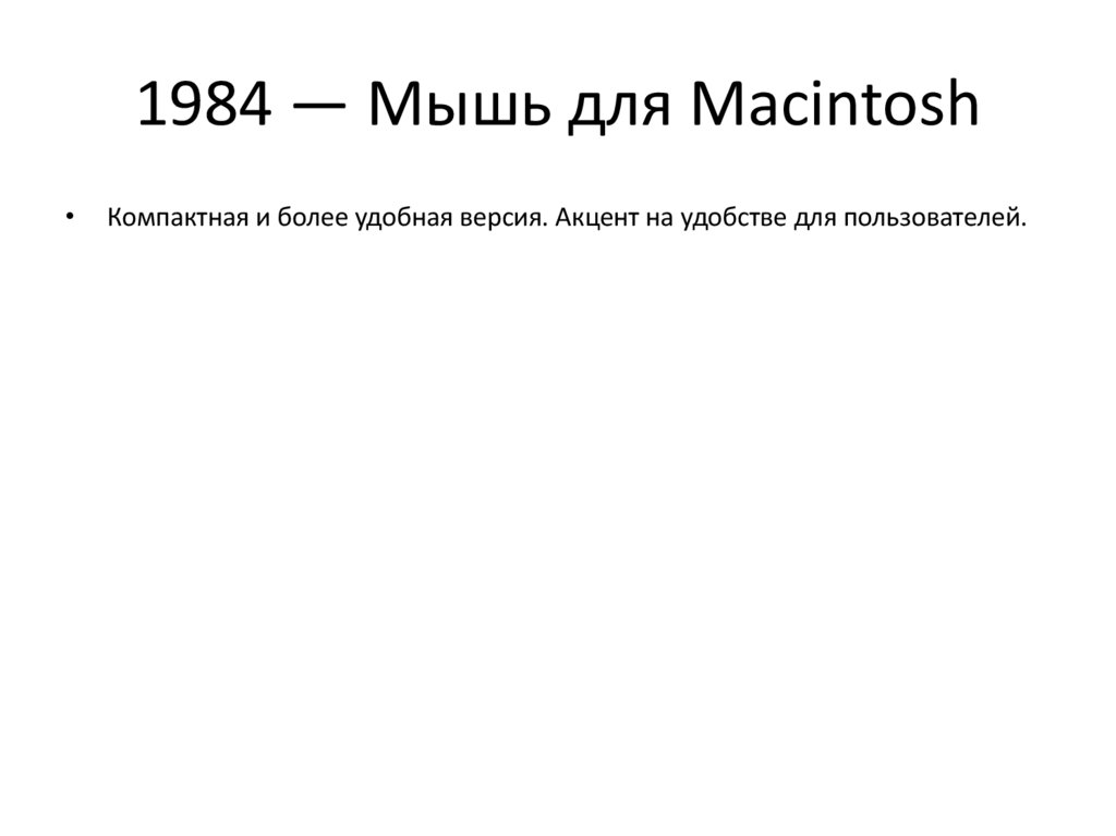 1984 — Мышь для MacintoshКомпактная и более удобная версия. Акцент на удобстве для пользователей.