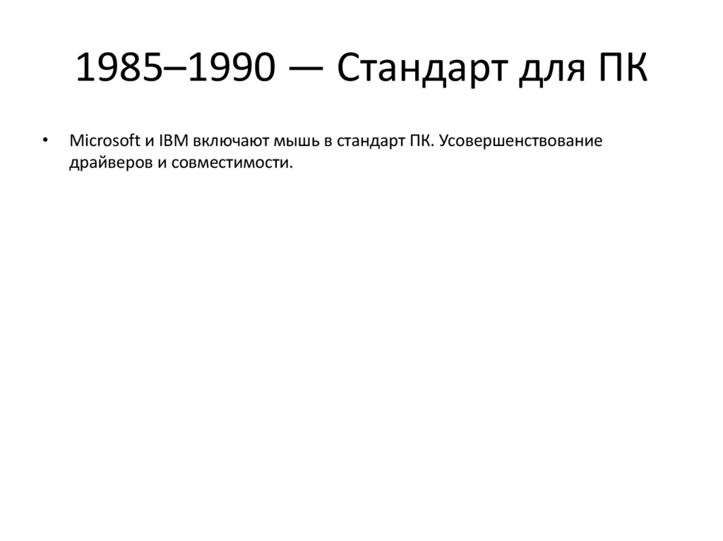 1985–1990 — Стандарт для ПКMicrosoft и IBM включают мышь в стандарт ПК. Усовершенствование