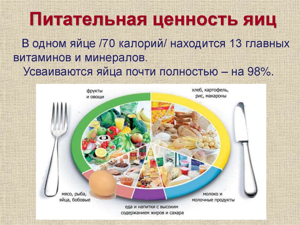 Питательная ценность яицВ одном яйце /70 калорий/ находится 13 главных