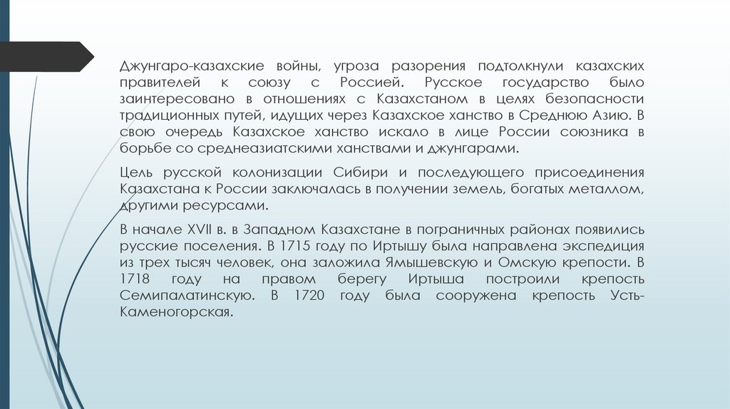 Джунгаро-казахские войны, угроза разорения подтолкнули казахскихправителей к союзу с Россией. Русское государство было