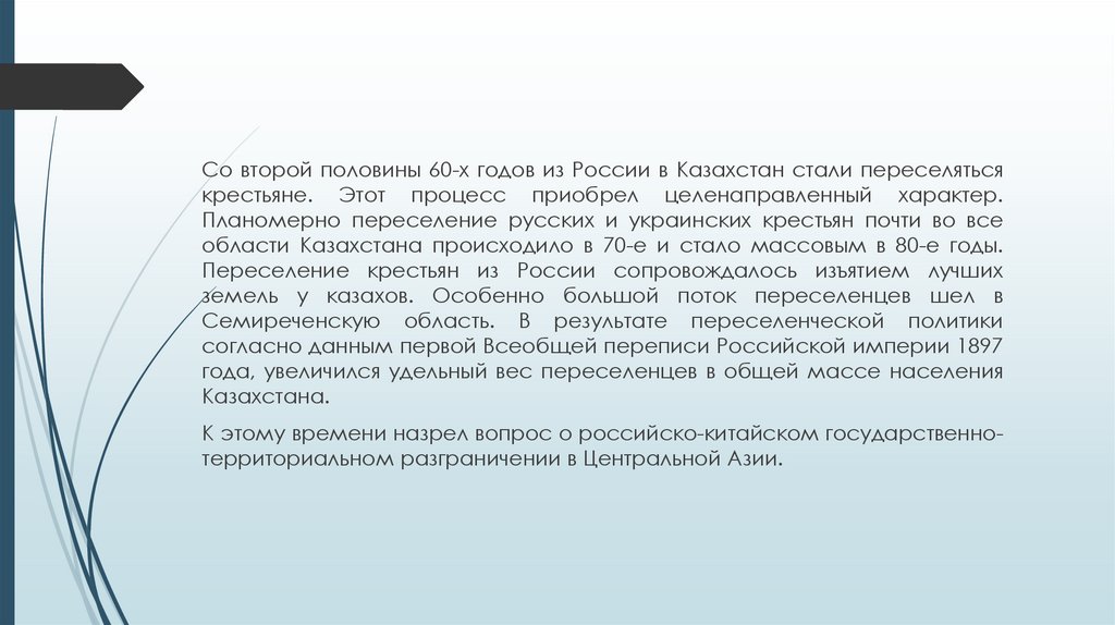 Со второй половины 60-х годов из России в Казахстан стали переселятьсякрестьяне. Этот процесс приобрел целенаправленный характер.