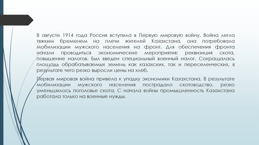В августе 1914 года Россия вступила в Первую мировую войну. Война леглатяжким бременем на плечи жителей Казахстана, она потребовала