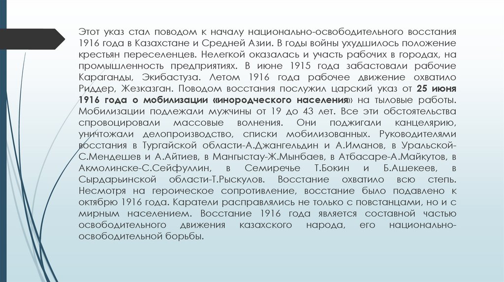 Этот указ стал поводом к началу национально-освободительного восстания1916 года в Казахстане и Средней Азии. В годы войны ухудшилось положение