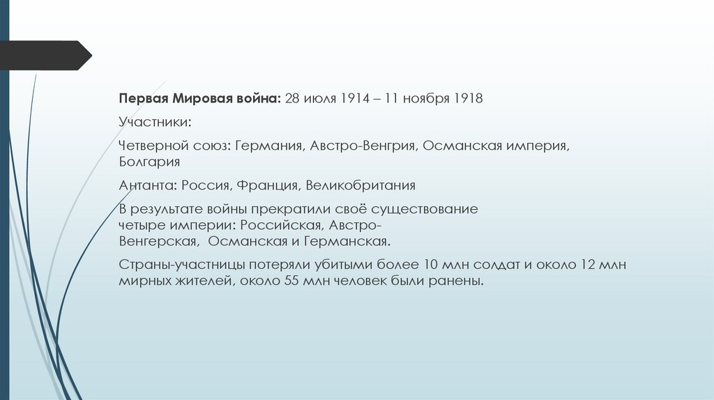 Первая Мировая война: 28 июля 1914 – 11 ноября 1918Участники: