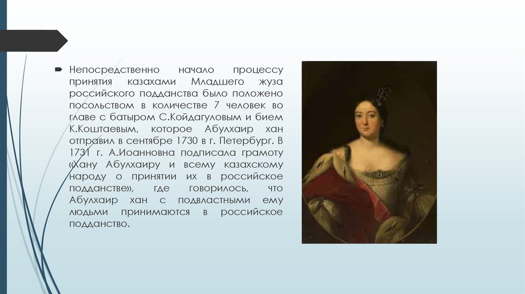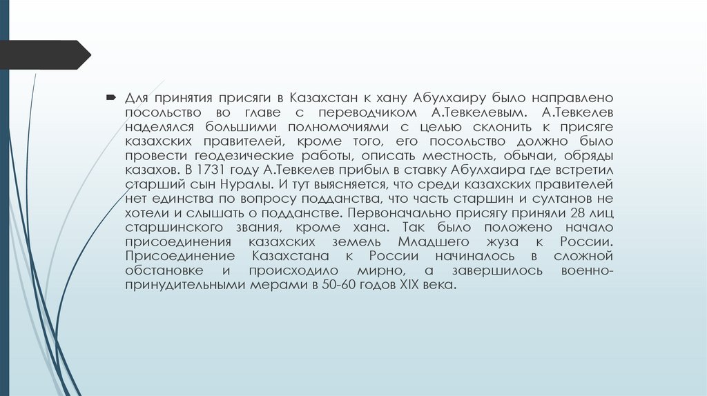 Для принятия присяги в Казахстан к хану Абулхаиру было направленопосольство во главе с переводчиком А.Тевкелевым. А.Тевкелев