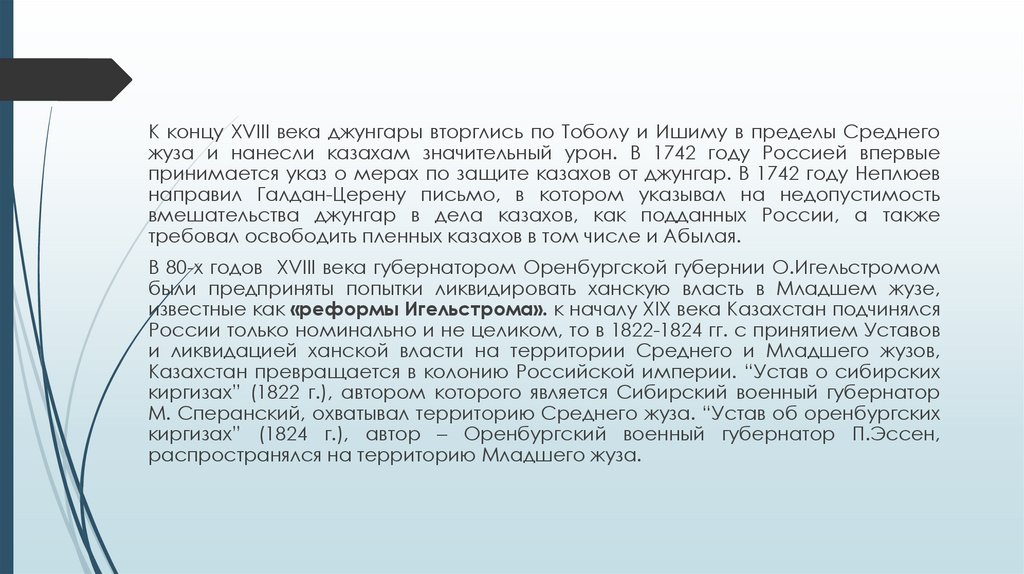 известные как «реформы Игельстрома». к началу ХІХ века Казахстан подчинялся