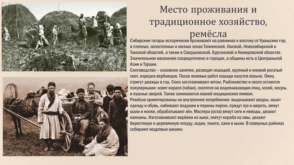 скотоводство, земледелие и ремесла. Религиозная жизнь основывалась на суннитском исламе. Культура сибирских татар – это