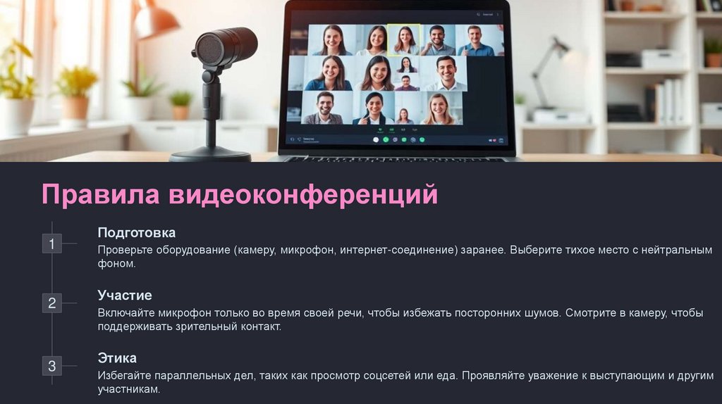 Избегайте параллельных дел, таких как просмотр соцсетей или еда. Проявляйте уважение к выступающим и другим