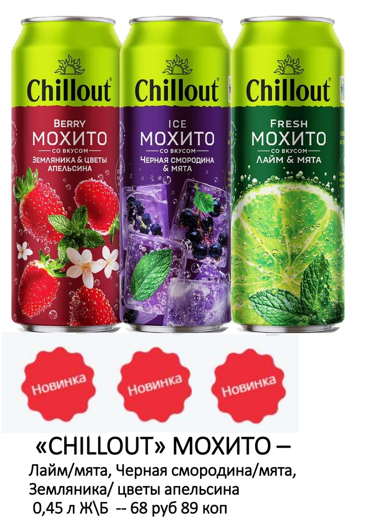 1. «CHILLOUT» МОХИТО –Лайм/мята, Черная смородина/мята, Земляника/ цветы апельсина 0,45 л Ж\Б -- 68 руб 89 коп