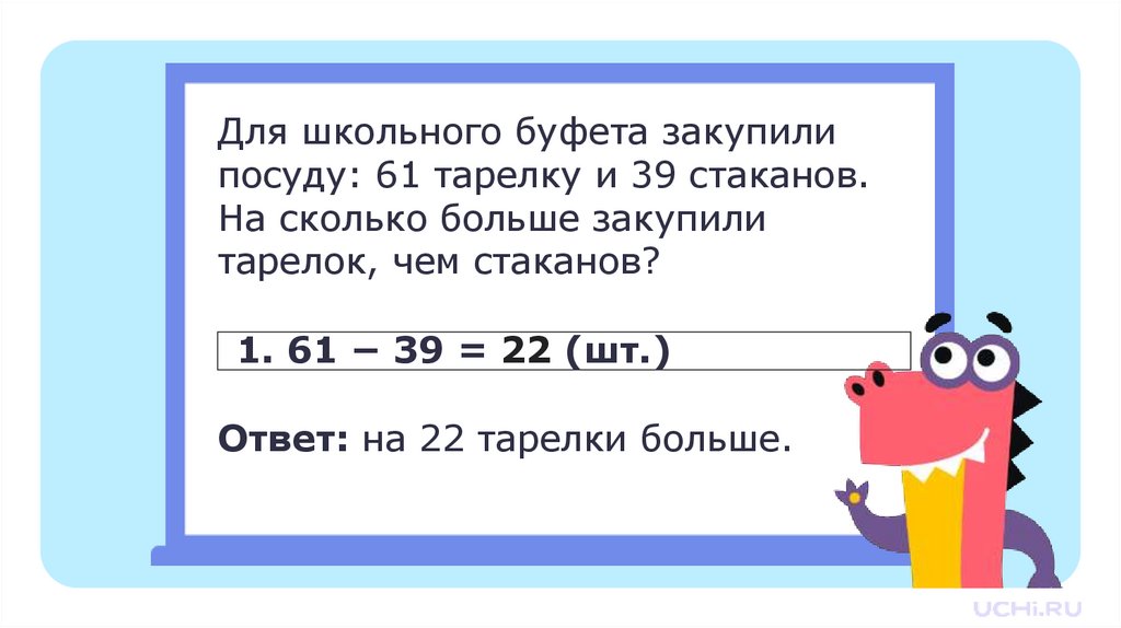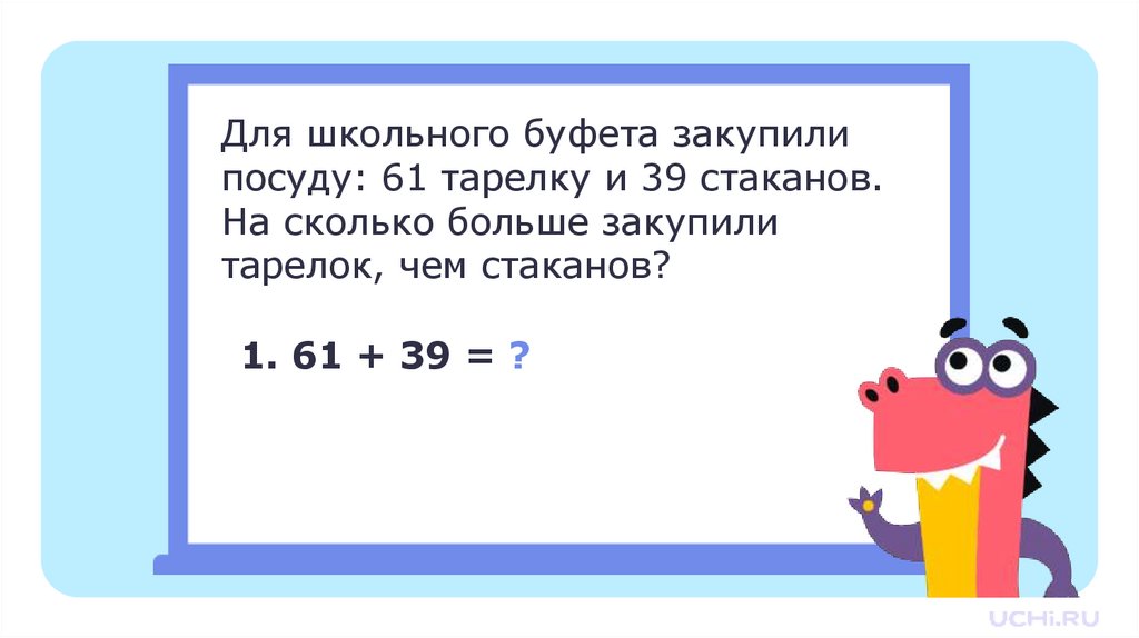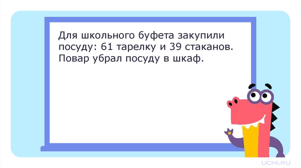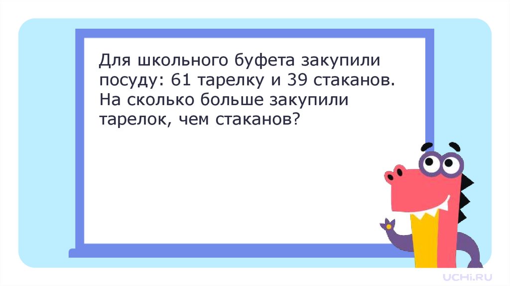 Для школьного буфета закупилипосуду: 61 тарелку и 39 стаканов.