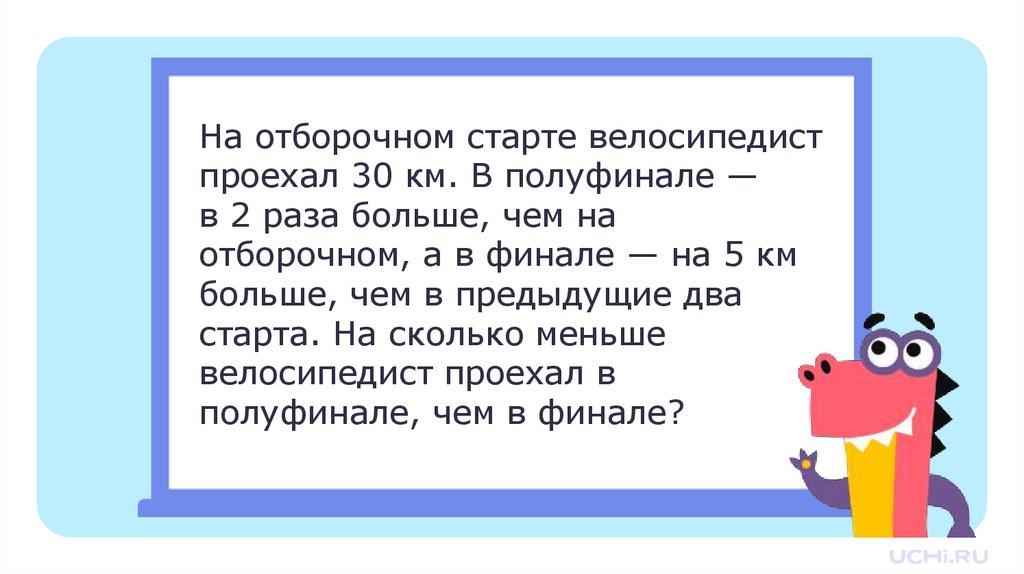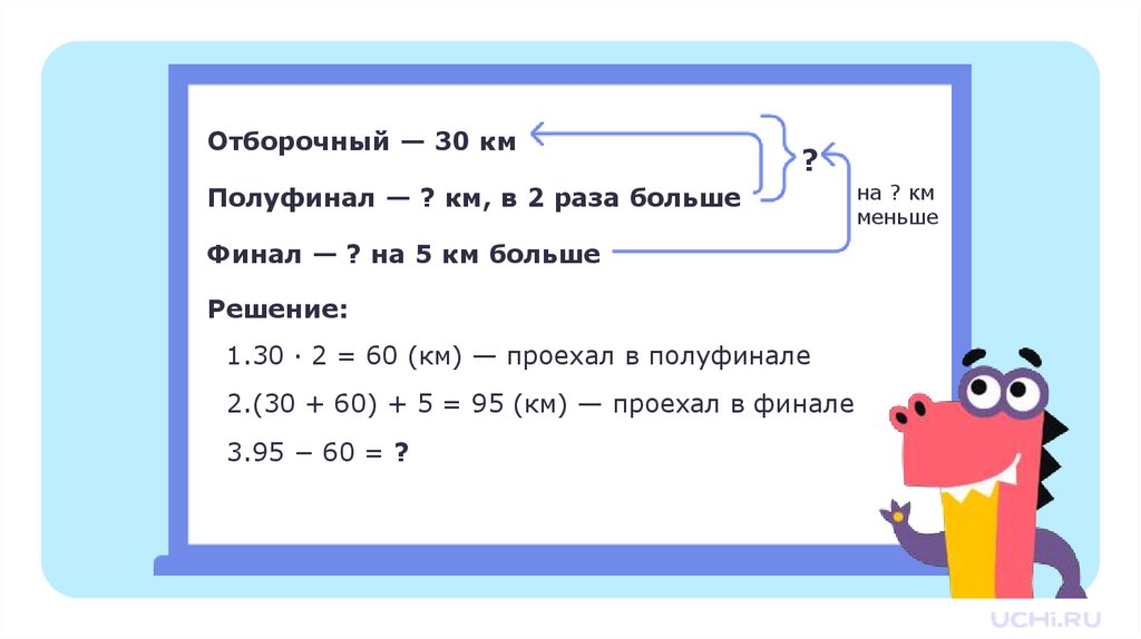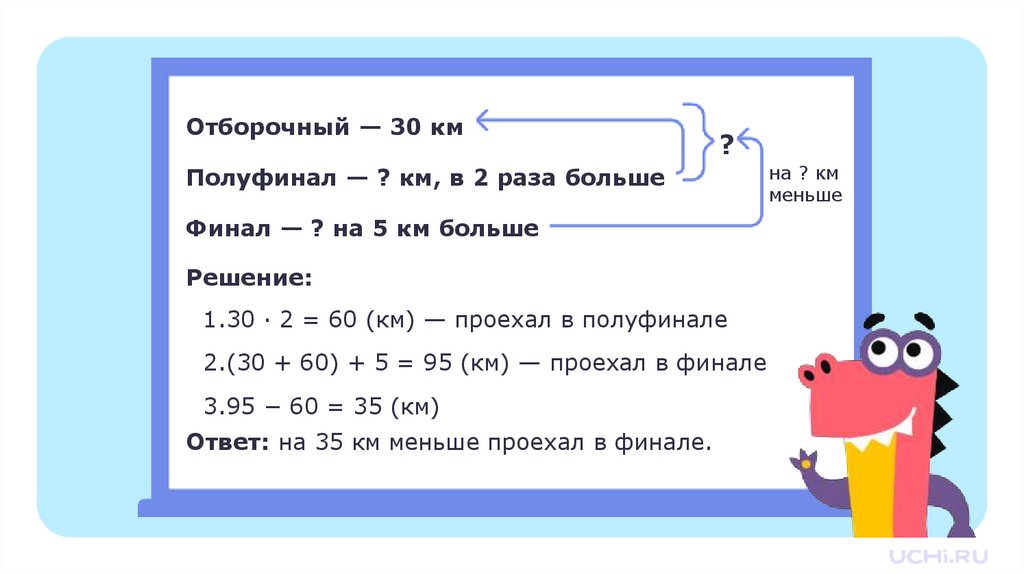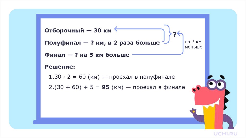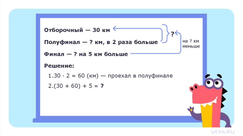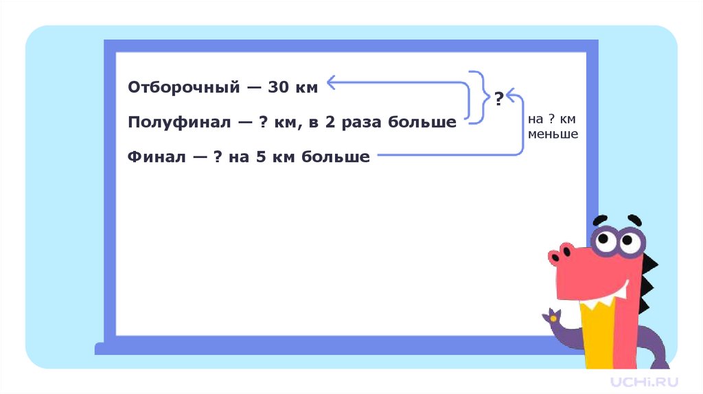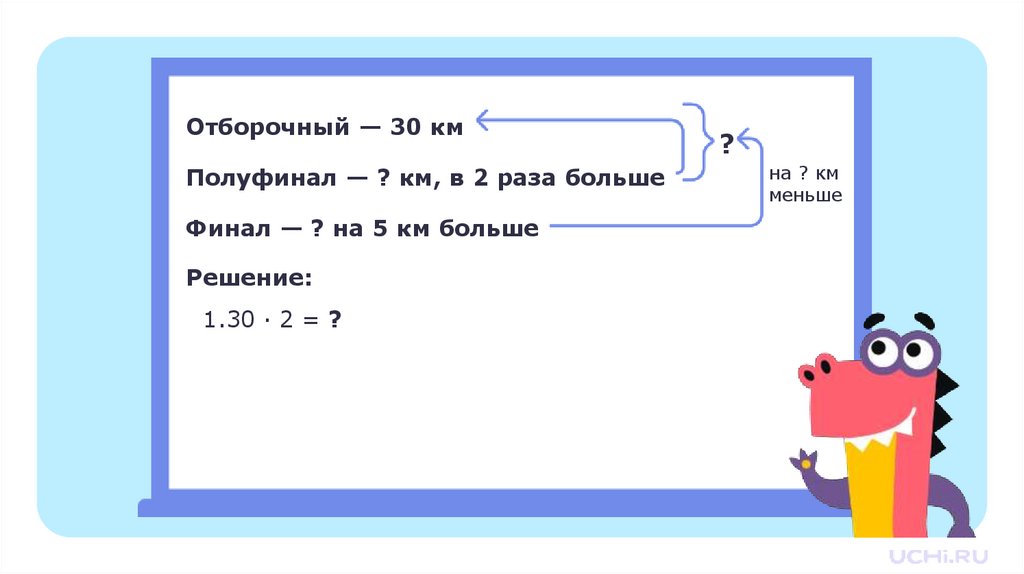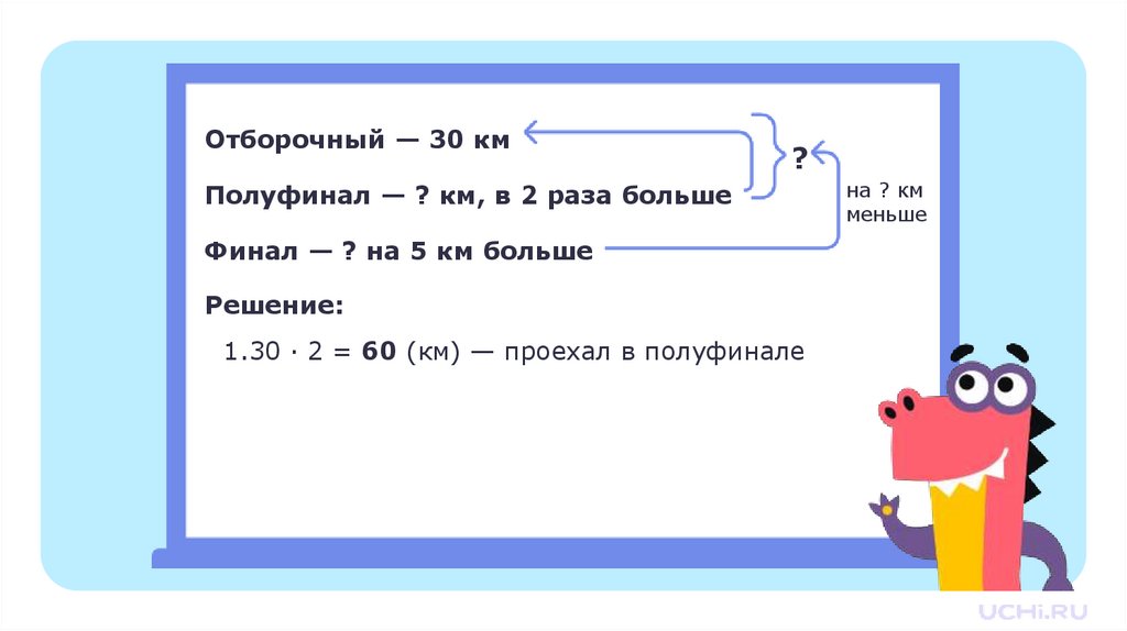 Отборочный — 30 кмПолуфинал — ? км, в 2 раза больше