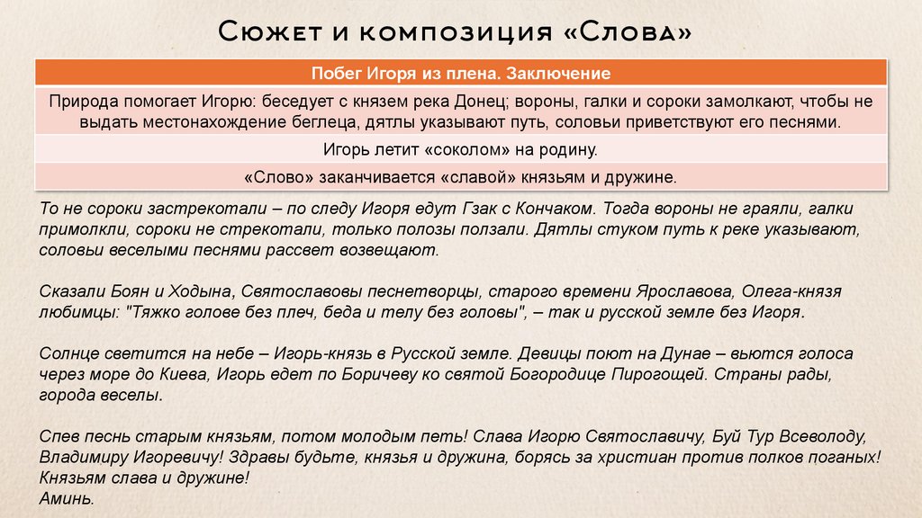 Сюжет и композиция «Слова»Побег Игоря из плена. Заключение