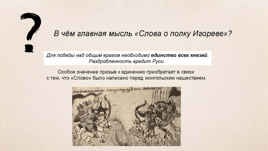 В чём главная мысль «Слова о полку Игореве»?Для победы над общим врагом необходимо единство всех князей.