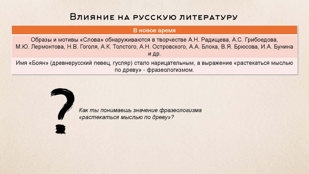 Имя «Боян» (древнерусский певец, гусляр) стало нарицательным, а выражение «растекаться мыслью