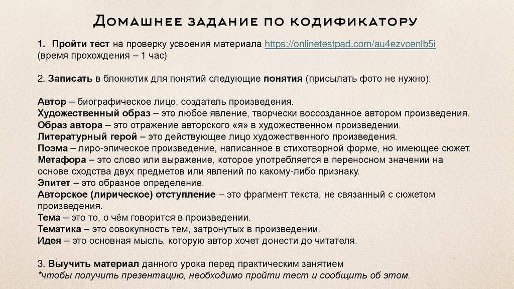 Домашнее задание по кодификатору1. Пройти тест на проверку усвоения материала https://onlinetestpad.com/au4ezvcenlb5i