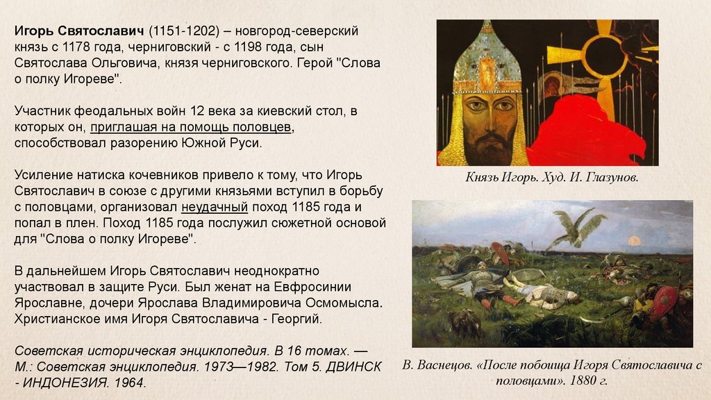 Игорь Святославич (1151-1202) – новгород-северскийкнязь с 1178 года, черниговский - с 1198 года, сын