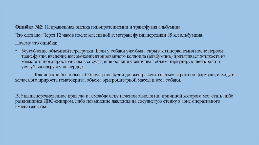 Ошибка №2: Неправильная оценка гипопротеинемии и трансфузия альбуминаЧто сделано: Через 12 часов после массивной гемотрансфузии перелили 85 мл альбумина.