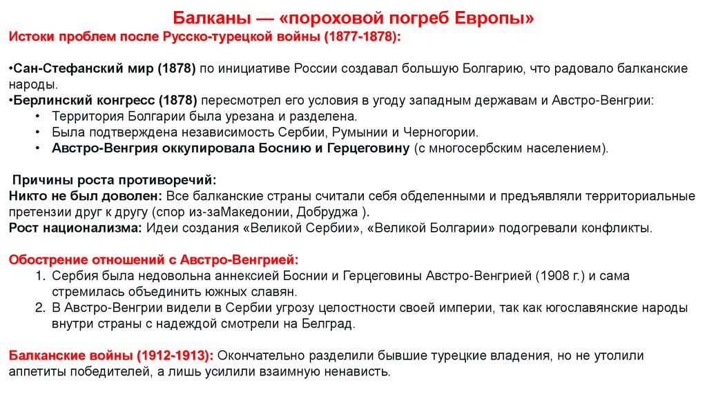 Балканы — «пороховой погреб Европы»Истоки проблем после Русско-турецкой войны (1877-1878):