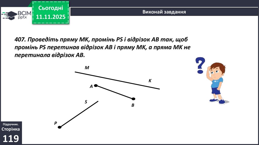 407. Проведіть пряму MK, промінь PS і відрізок AB так, щоб
