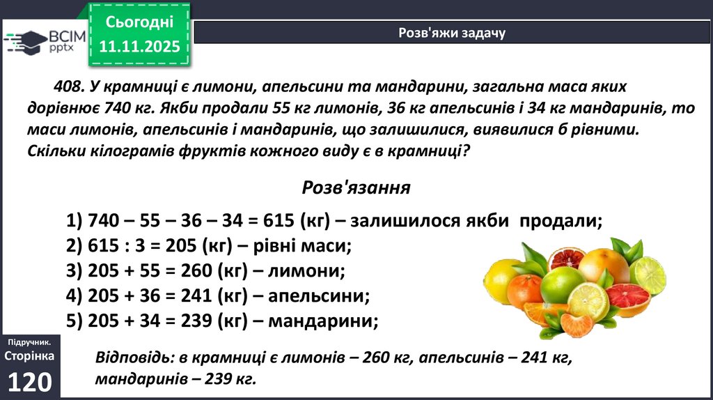 408. У крамниці є лимони, апельсини та мандарини, загальна маса яких