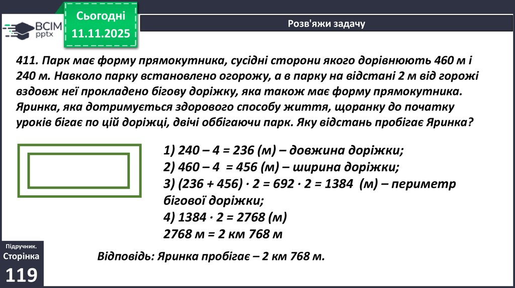 411. Парк має форму прямокутника, сусідні сторони якого дорівнюють 460 м і