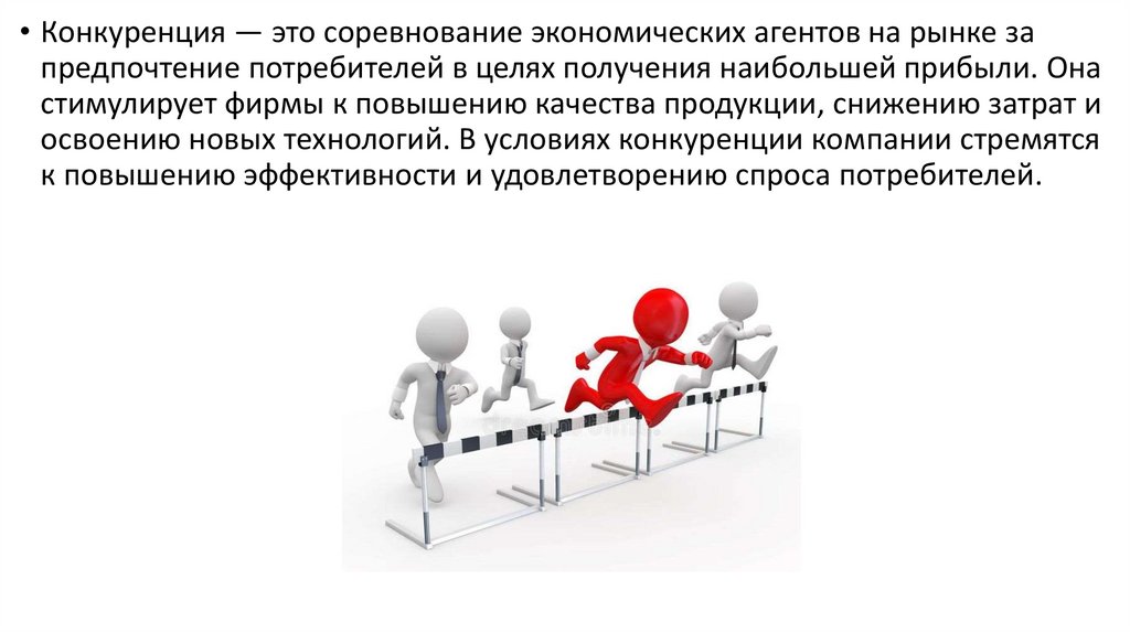 • Конкуренция — это соревнование экономических агентов на рынке запредпочтение потребителей в целях получения наибольшей прибыли. Она