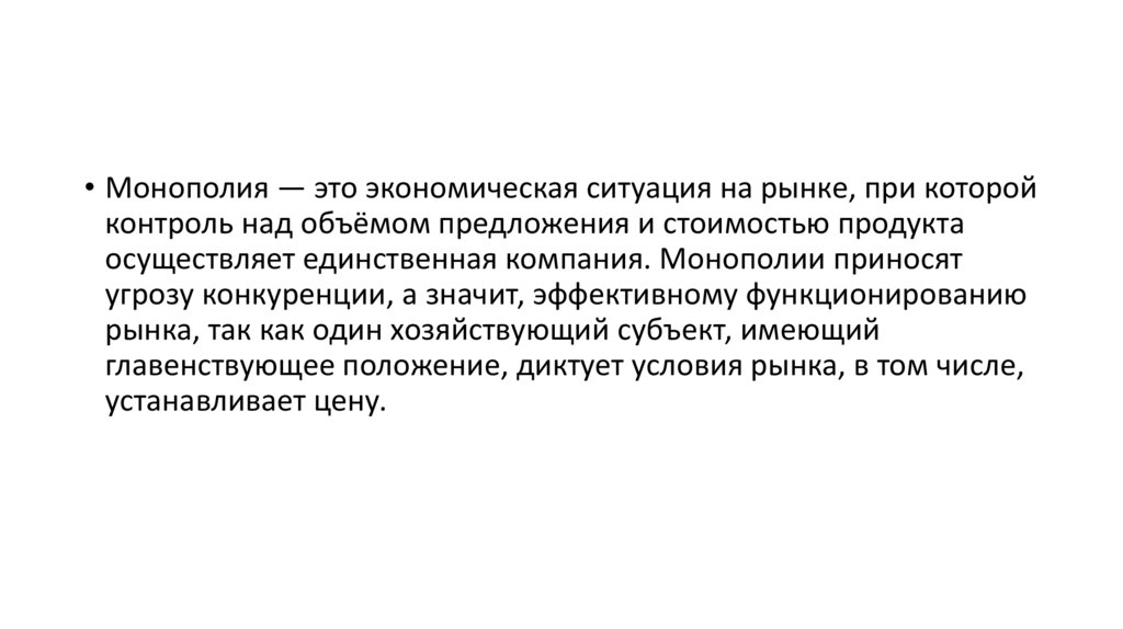 • Монополия — это экономическая ситуация на рынке, при которойконтроль над объёмом предложения и стоимостью продукта