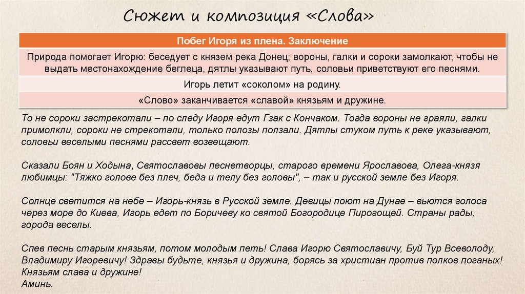 Сюжет и композиция «Слова»Побег Игоря из плена. Заключение