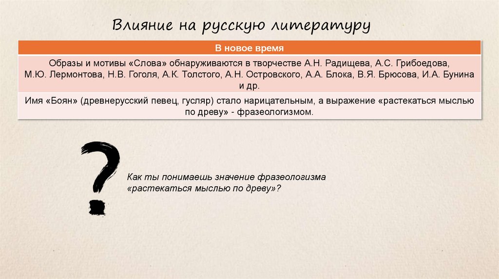 Имя «Боян» (древнерусский певец, гусляр) стало нарицательным, а выражение «растекаться мыслью
