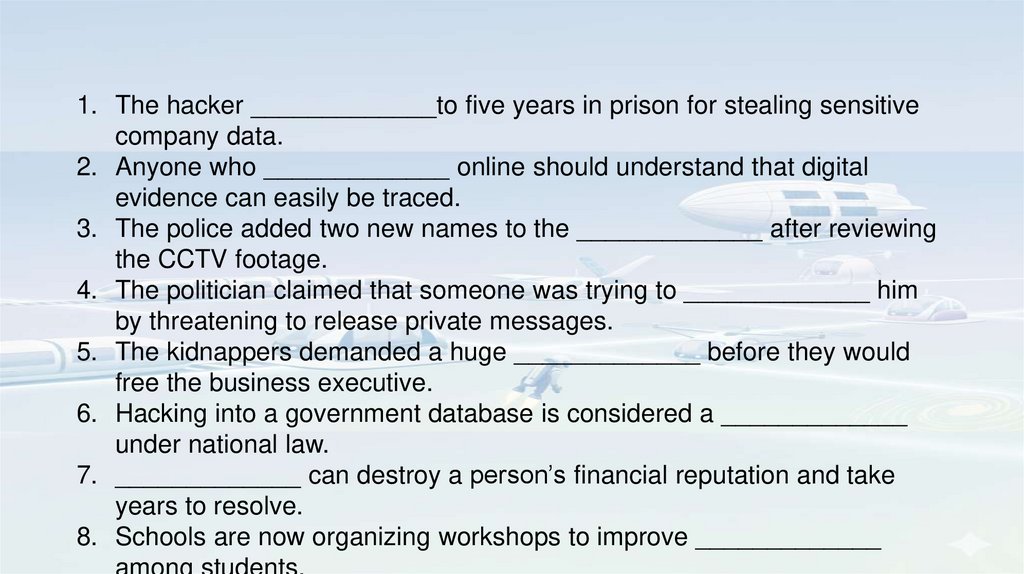 1. The hacker _____________to five years in prison for stealing sensitivecompany data.
