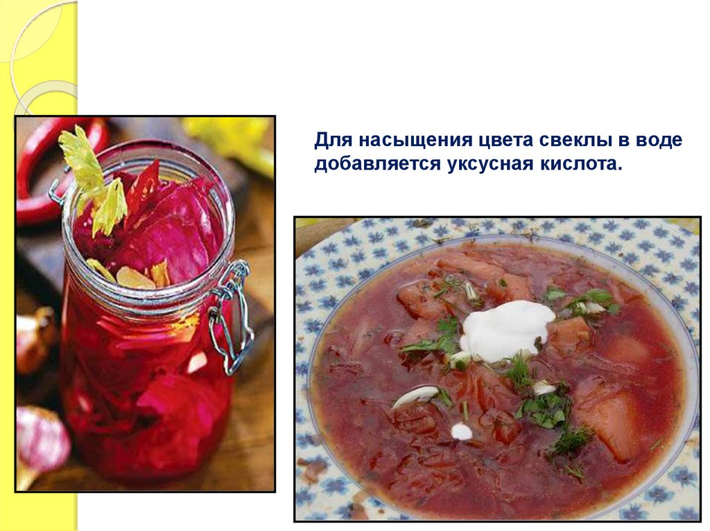 Для насыщения цвета свеклы в водедобавляется уксусная кислота.