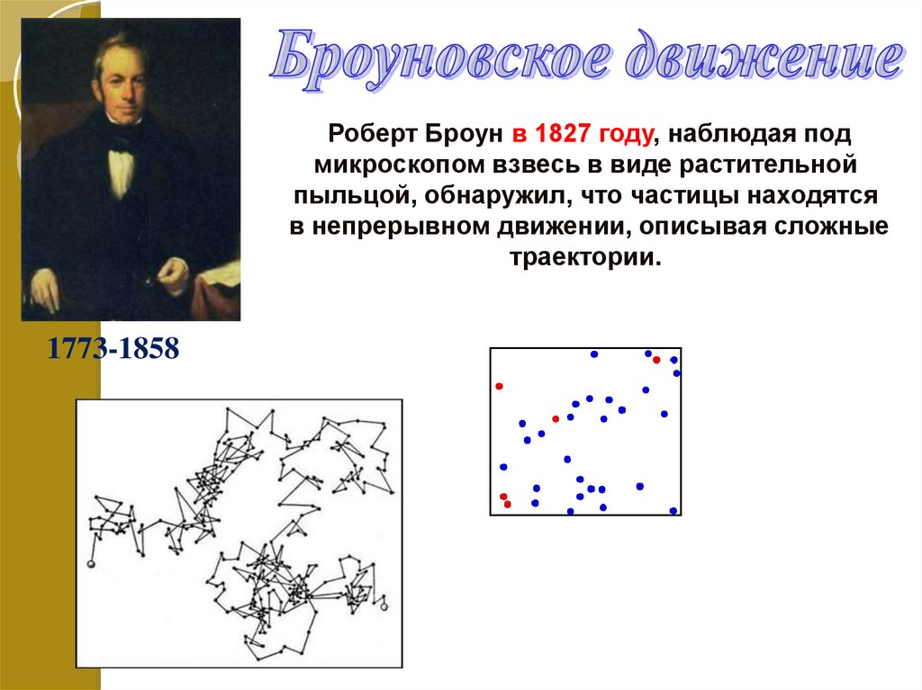 Роберт Броун в 1827 году, наблюдая подмикроскопом взвесь в виде растительной