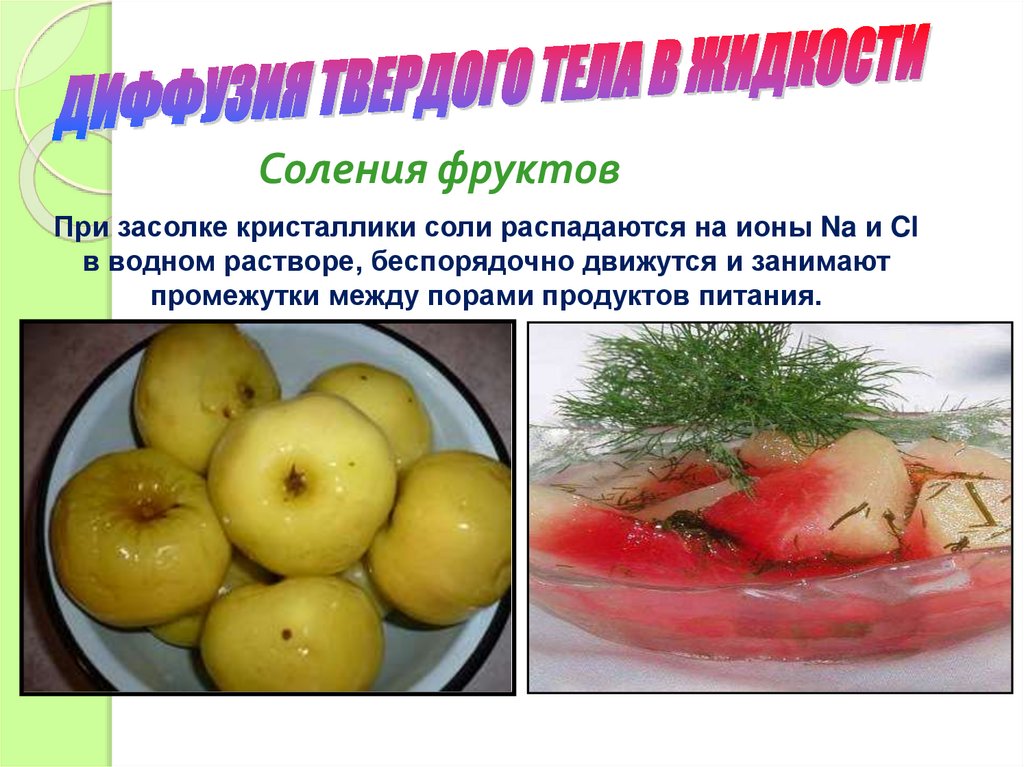 Соления фруктовПри засолке кристаллики соли распадаются на ионы Na и Cl