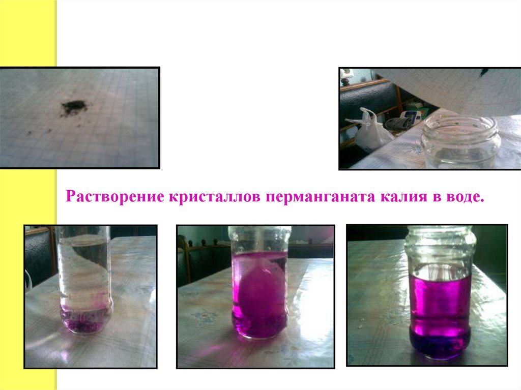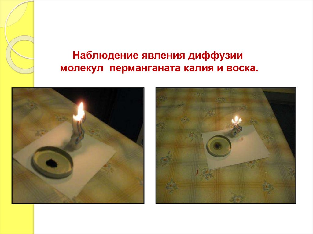 Наблюдение явления диффузиимолекул перманганата калия и воска.