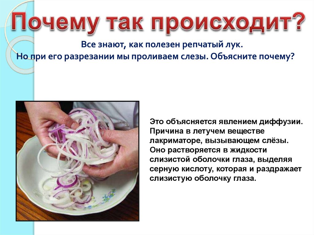 Все знают, как полезен репчатый лук.Но при его разрезании мы проливаем слезы. Объясните почему?