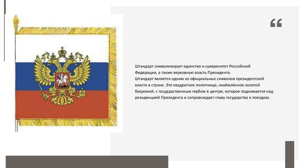 Штандарт символизирует единство и суверенитет РоссийскойФедерации, а также верховную власть Президента.