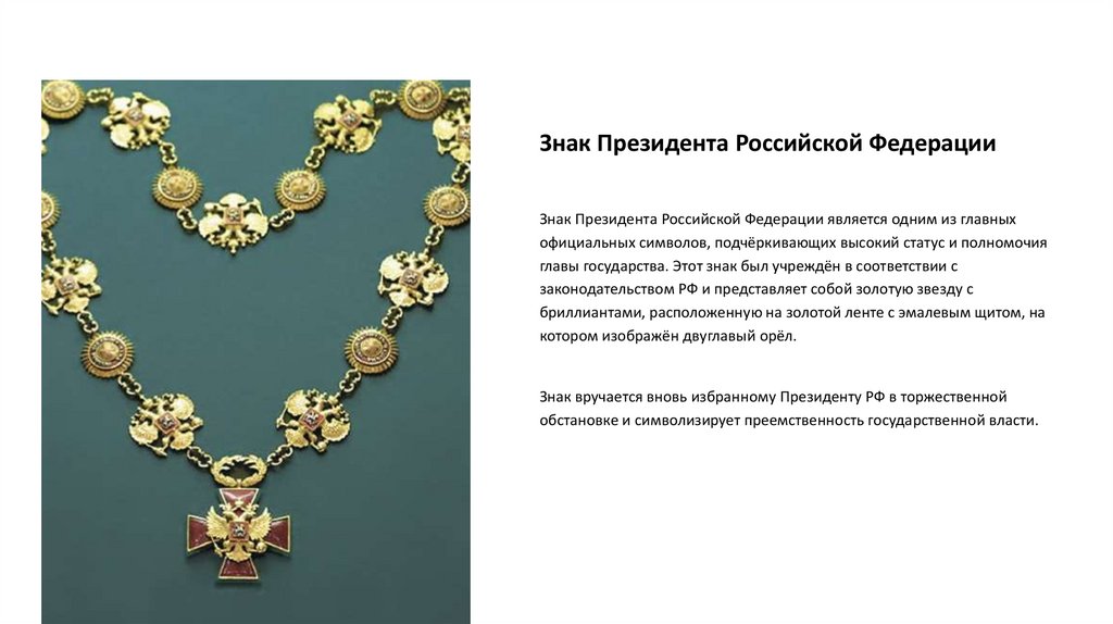 Знак Президента Российской ФедерацииЗнак Президента Российской Федерации является одним из главных