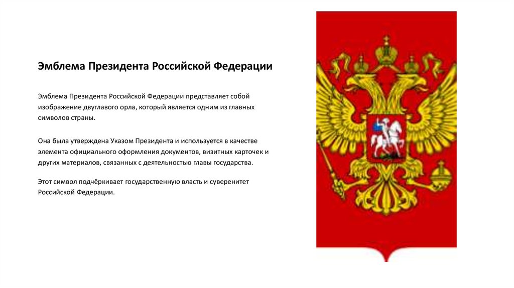 Эмблема Президента Российской ФедерацииЭмблема Президента Российской Федерации представляет собой