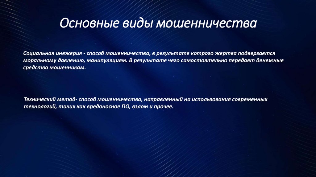 Основные виды мошенничестваСоциальная инежерия - способ мошенничества, в результате котрого жертва подвергается