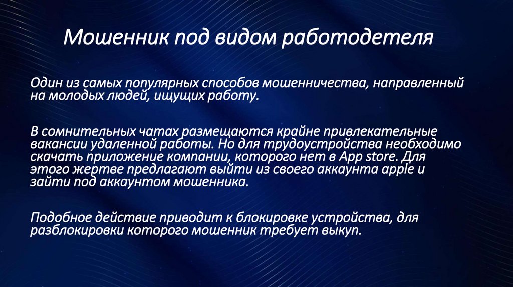Мошенник под видом работодетеляОдин из самых популярных способов мошенничества, направленный