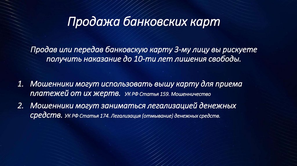 Продажа банковских картПродав или передав банковскую карту 3-му лицу вы рискуете