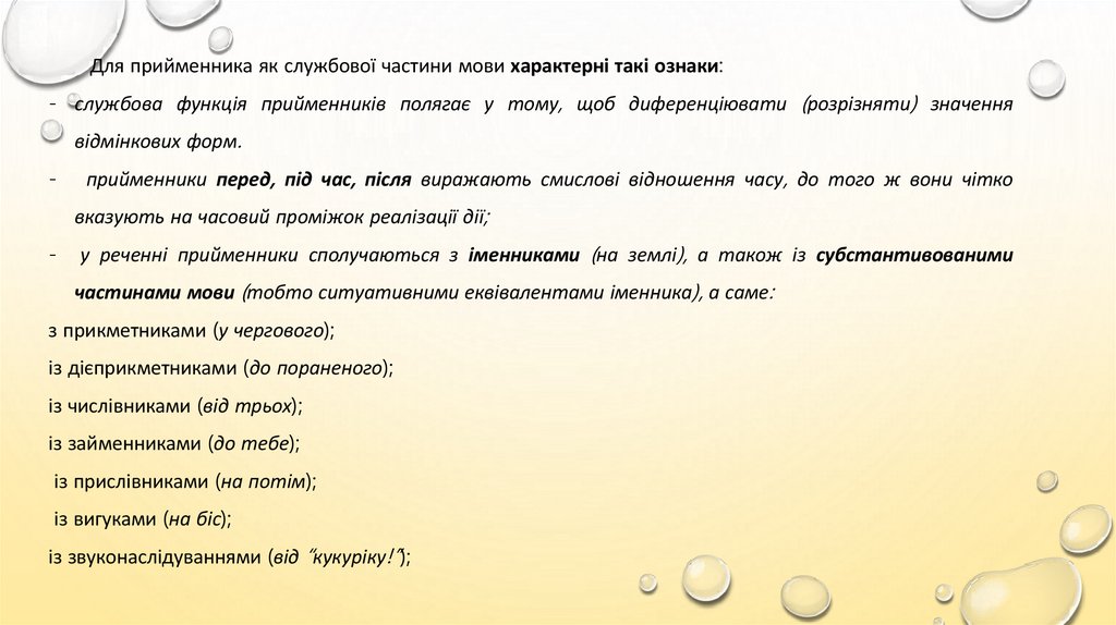 Для прийменника як службової частини мови характерні такі ознаки:- службова функція прийменників полягає у тому, щоб диференціювати (розрізняти) значення