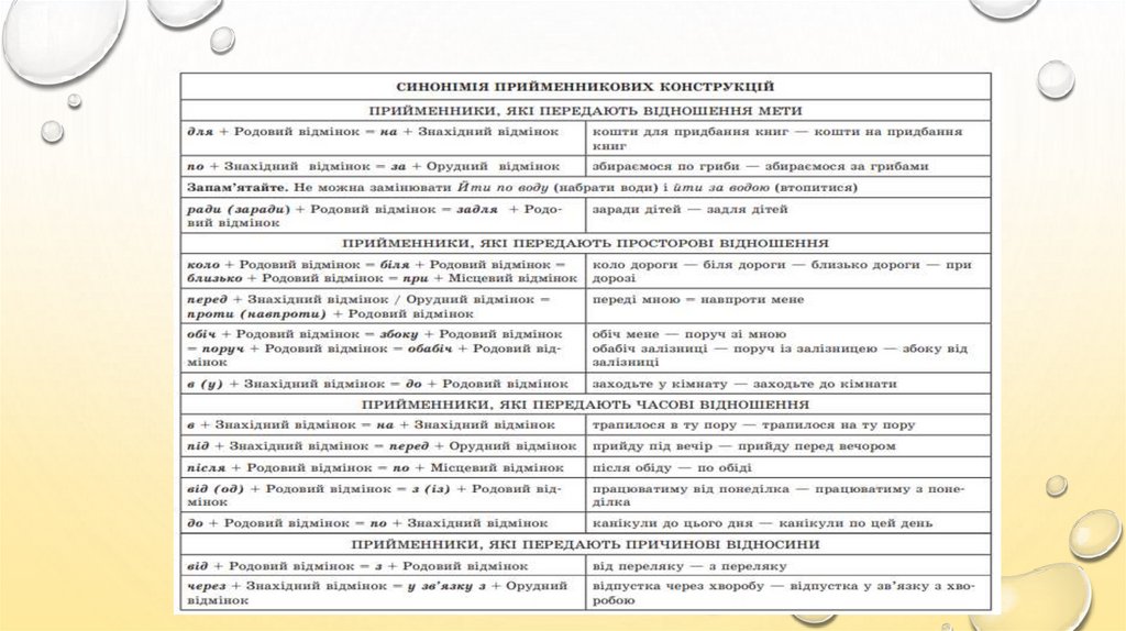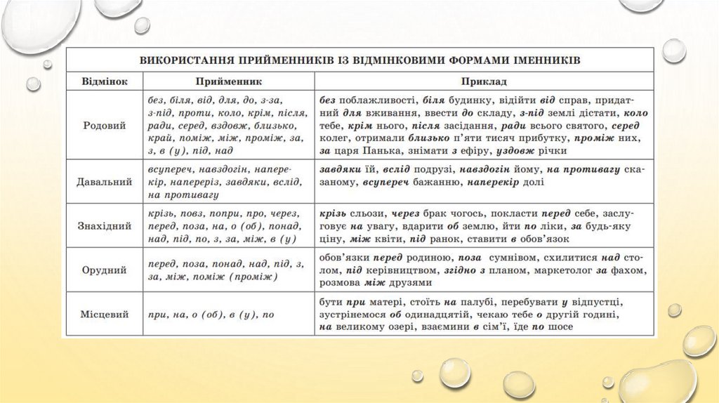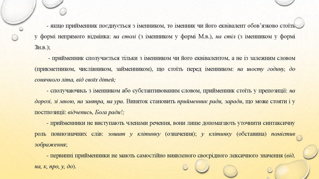 - якщо прийменник поєднується з іменником, то іменник чи його еквівалент обов’язково стоїтьу формі непрямого відмінка: на столі (з іменником у формі М.в.), на стіл (з іменником у формі