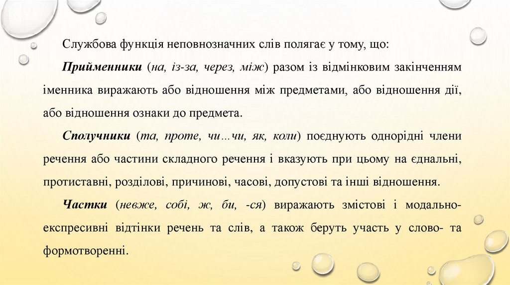 Службова функція неповнозначних слів полягає у тому, що:Прийменники (на, із-за, через, між) разом із відмінковим закінченням