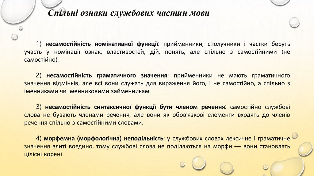 Спільні ознаки службових частин мови1) несамостійність номінативної функції: прийменники, сполучники і частки беруть