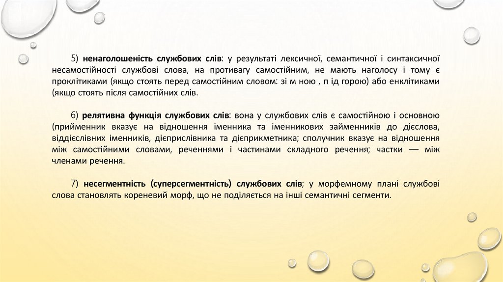 7) несегментність (суперсегментність) службових слів; у морфемному плані службові